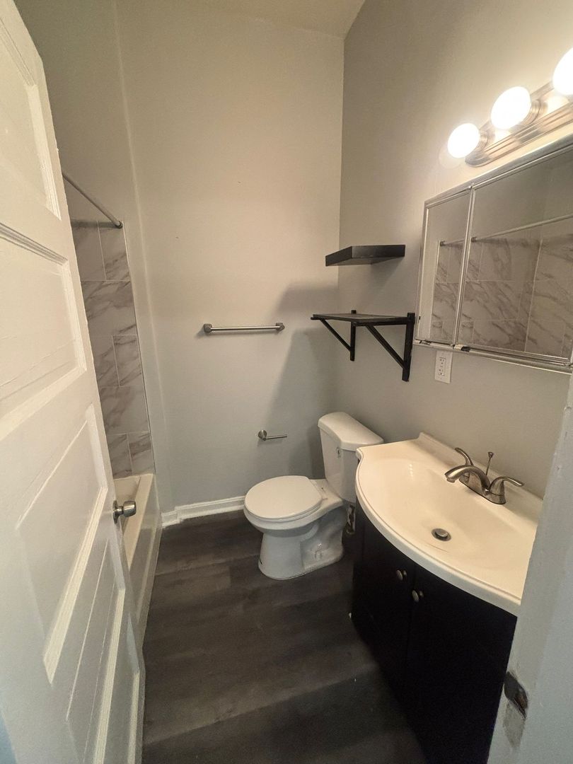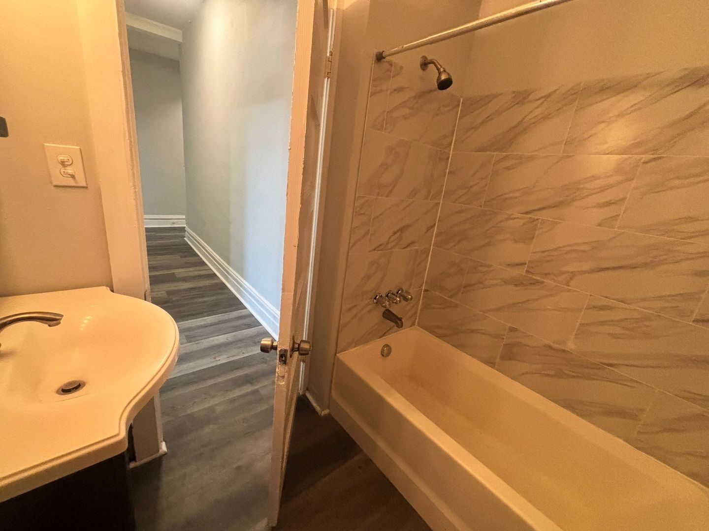- Stylish bathroom with a contemporary vanity, subway tile shower surround, and updated fixtures.