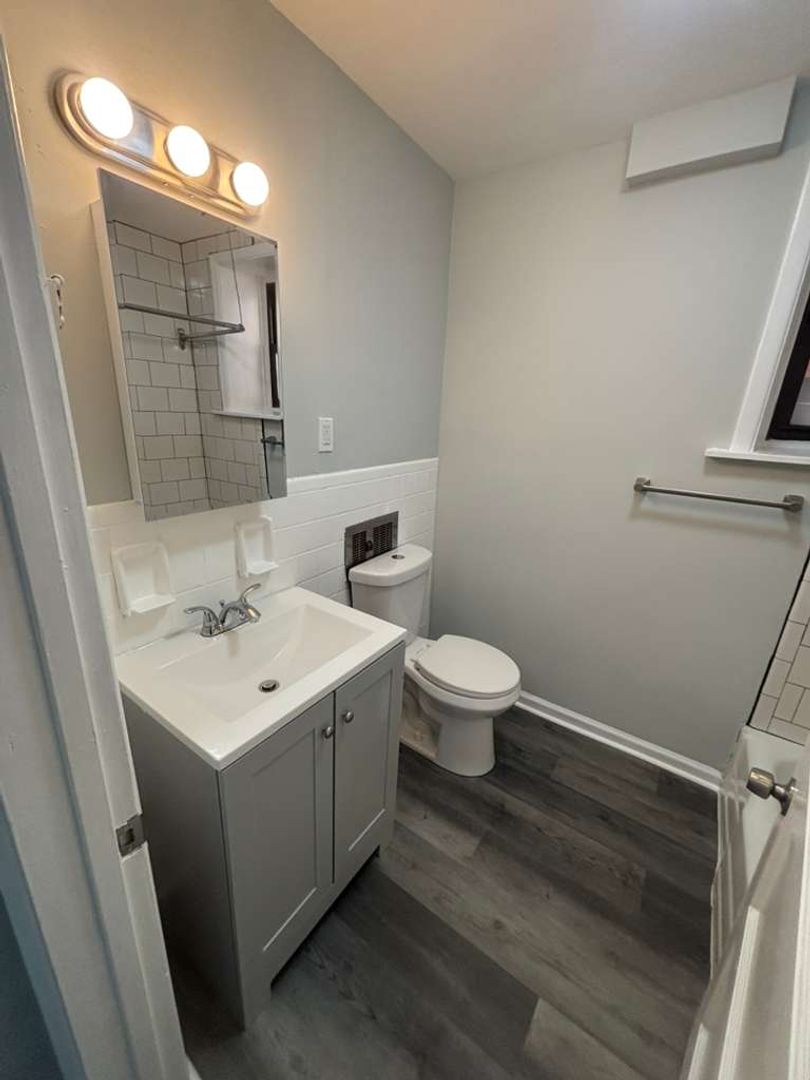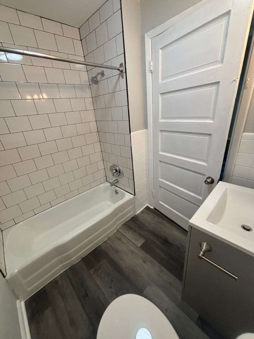 -Elegant bathroom with updated fixtures, fresh tile surround, and modern vanity