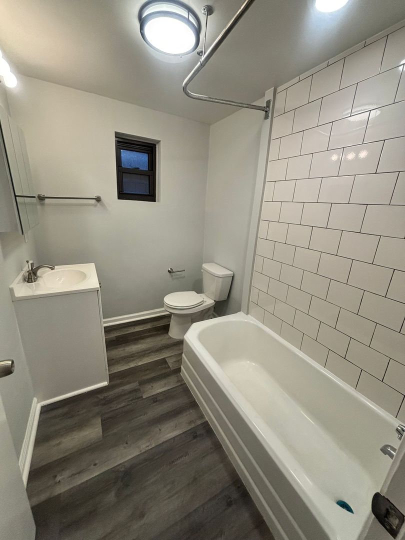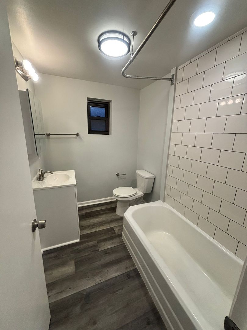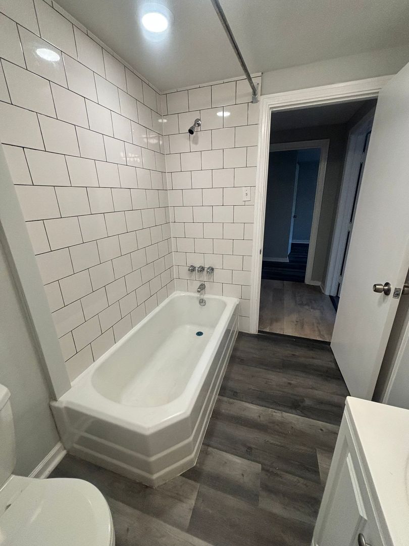 – Renovated bathroom featuring a new vanity, modern tile, and fresh fixtures
